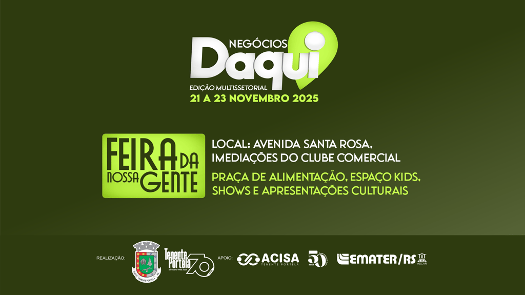 A Feira Negócios Daqui é um evento que visa promover e fortalecer o comércio local do município de Tenente Portela. Destinada exclusivamente a empresas locais, a feira proporciona uma plataforma para pequenos e médios empresários apresentarem seus produtos e serviços à comunidade, sem custos para as empresas participantes.